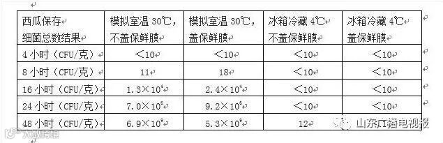 出现显著差别的是模拟室温30℃保存16小时后,切除表面的西瓜,菌落总数明显比没有切除表面的西瓜要少100倍。冰箱里冷藏存放时,切除表面的西瓜存放48小时的细菌总数均<10。