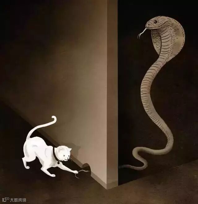 画中的猫把蛇尾当成鼠尾,毫不畏惧地用爪子抓着蛇的尾巴。