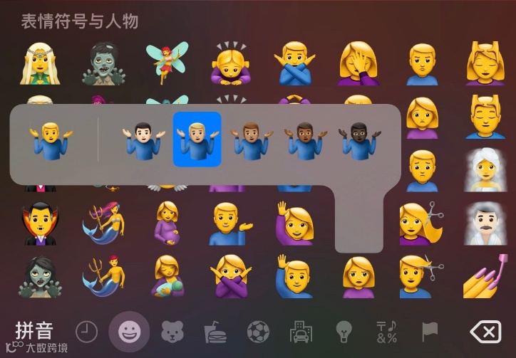 1、键盘左下角可直接点击Emoji表情,长按脸部可设置自定义肤色,下次再输入该表情时则使用你自定义的肤色。
