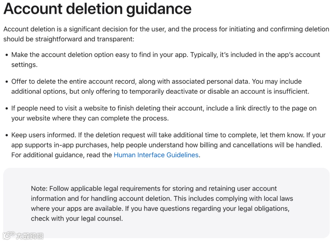 针对这种问题,苹果在新规中也表示:应用程序必须提供完全删除用户账户(注销账户)的选项,而不仅仅是禁用或退出登录,苹果要求所有与该帐户相关的个人数据必须被删除。