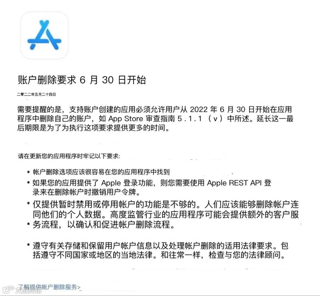 而针对这种现象,苹果在去年对 App Store 的指导方针进行了调整,要求在 2022 年 1 月 31 日前允许创建账号的 App 必须允许用户从 App 中删除账号。