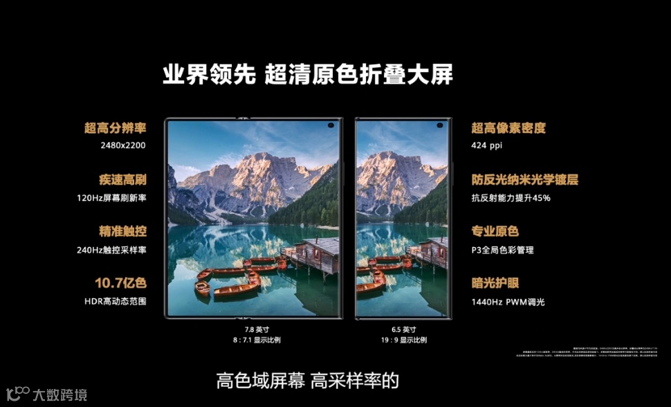 配备7.8英寸可折叠屏,424ppi像素密度,支持最高120Hz智能刷新率、1440Hz 高频PWM调光。