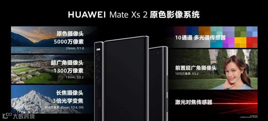 华为Mate Xs 2搭载原色影像系统,拥有5000万像素原色摄像头、1300万像素超广角摄像头、800万像素3倍光学变焦摄像头。支持华为影像™ XD Optics 计算光学、XD Fusion Pro 原色引擎。