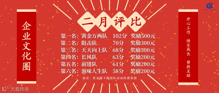 根据《安费诺诚信文化圈管理办法》规定,及各队长已确认的积分情况统计,以上公布2月文化圈月度评比结果。