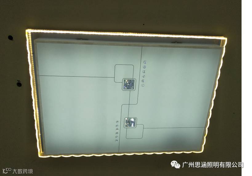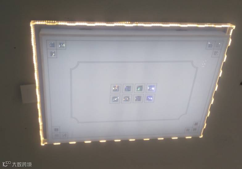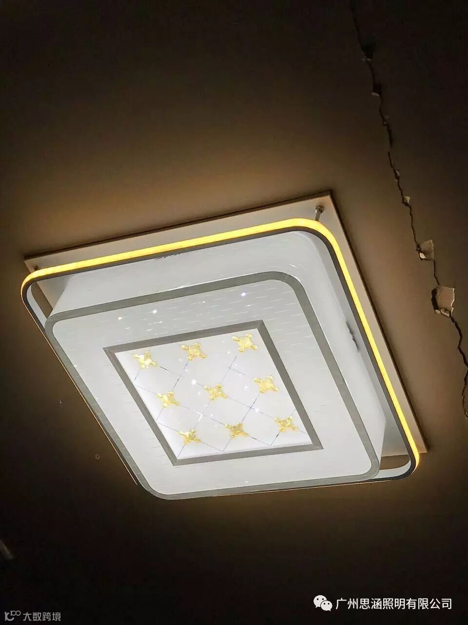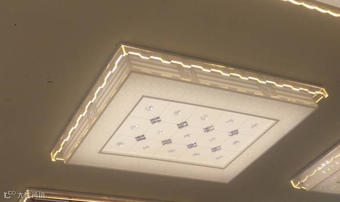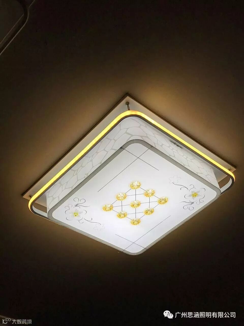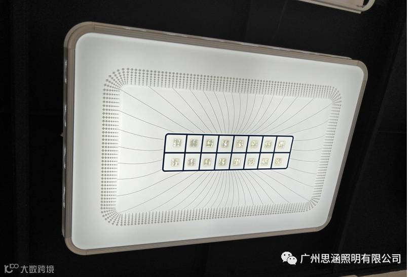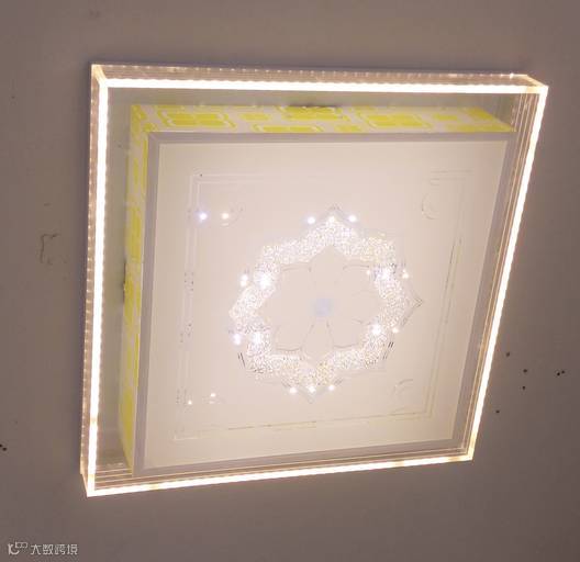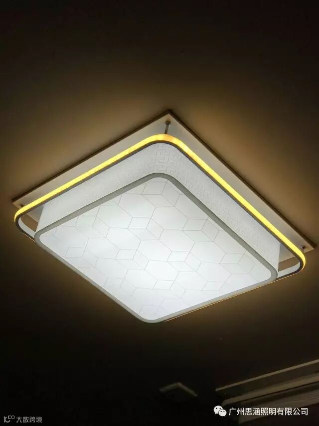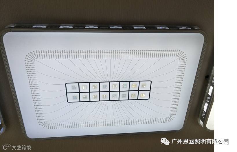 这款吸顶灯的尺寸也是960*650mm,中间有16个方形的淡黄色装饰物,有光线散射一样的淡淡条纹,美观大方,材料为亚克力,一体成型。光源配置为单色80W,双色160W,三安芯片5730超亮灯珠,恒流双路输出高质量驱动电源。