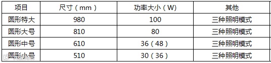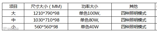 300*300mm,380*380mm,450*450mm,520*520mm,650*430mm,650*650mm,830*650mm,930*650mm。一共八种规格,可以根据需要照明的面积大小选择不同的尺寸。灯罩为亚克力材质。