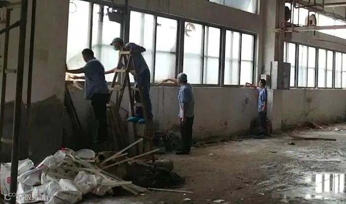 车间翻新, 义工们也投入其中,完成力所能及的任务,他们正一丝不苟地刮掉窗户上的残胶。