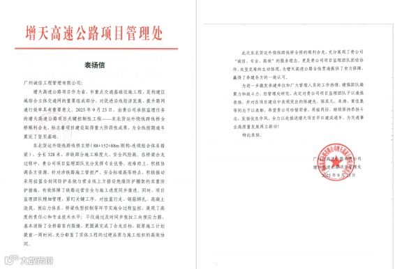 增天高速公路项目管理处特对诚信公司项目监理团队予以通报表扬。这既是对诚信公司监理团队专业能力的充分肯定,也是对诚信公司诚信、专业、高效服务理念的高度认可。诚信公司将继续秉持精益求精、追求卓越的质量理念,全力以赴推进增天高速后续工程建设,为完善区域路网布局、促进沿线经济发展贡献专业力量。