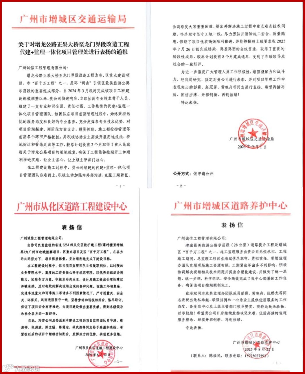 近日,广州市从化区道路工程建设中心、广州市增城区交通运输局、广州市增城区道路养护中心等交通部门陆续发布通报或表扬信,对道路研究院诚信公司在“百千万工程”中展现的卓越服务能力予以肯定,特别表彰公司在“代建+监理一体化”模式创新、重点项目监理服务中的贡献。