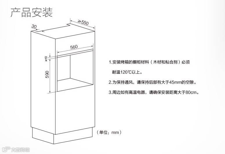 嵌入式电烤箱由于嵌入的美观性,要求针对所选择烤箱的尺寸,在橱柜留个合适的尺寸空间进行安装。橱柜留孔确保深大于555mm,高(大于580mm,小于590mm),宽(大于560mm,小于595mm)。现在有些橱柜厂家为了节省材料,橱柜内部进深都不足560mm,为了使用方便,请广大消费者要求厂家把橱柜内部进深做到大于560mm。