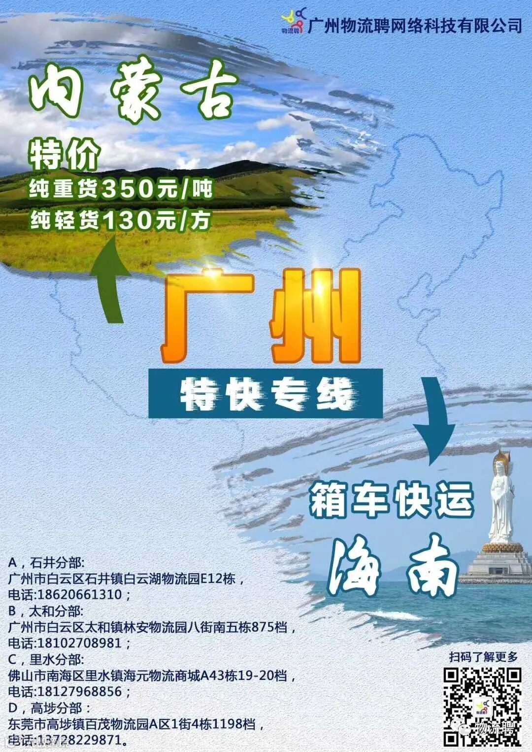 2020年3月开通广州-海口专线,中转内蒙包括整个华北区域需要经广州分流至海口的货物,解决直达价格高等问题。一样的速度不一样的价格。