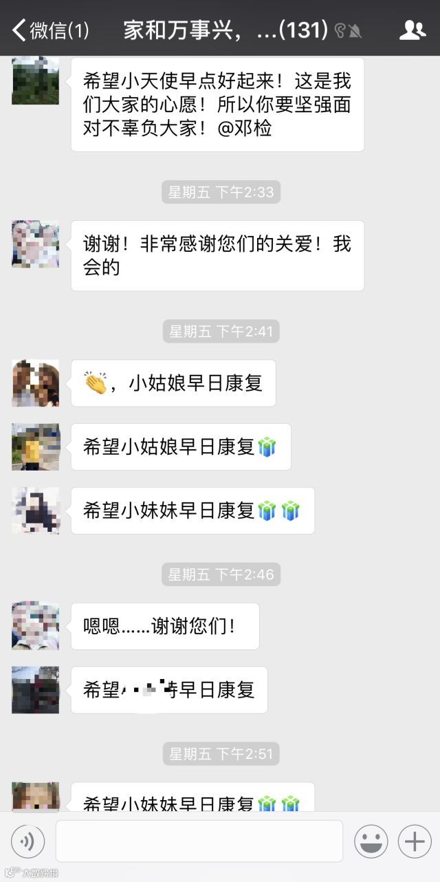 2018年1月底,家和集团公司员工邓检同志的女儿被诊断出患有急性淋巴细胞白血病。医生建议马上住院治疗,在短短的一周时间,治疗已经花费6万多元。医生还表示,要想治愈小女孩的白血病,需要准备60万元左右的医疗费。邓检同志的母亲在2016年底才得了脑梗塞病,当时是由于家和集团董事长熊文辉的爱心款、亲戚朋友借支以及社会各界爱心人士的援助接受的治疗,目前她仍瘫痪在床需要照顾,并需要长期服药控制病情。小女孩的白血病犹如噩耗般,让这个本身就欠债累累的家庭更是雪上加霜。