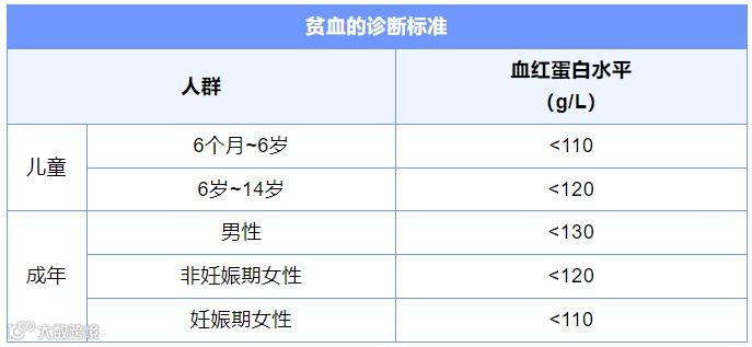 当怀疑有贫血时,需要做血常规检查,根据1972年WHO制定的诊断标准,即在海平面地区,血红蛋白(Hb)低于以下水平时诊断为贫血(具体见下表)。