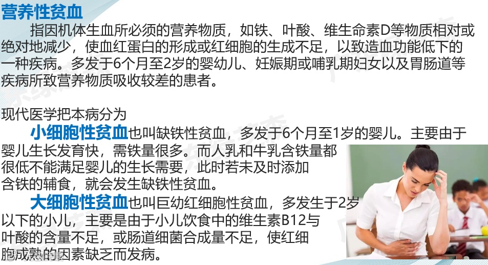 如缺铁性贫血是最常见的贫血类型,补充体内足够量的铁可促进机体合成血红蛋白方式包括口服铁剂(硫酸亚铁、富马酸铁)和注射铁剂(右旋糖酐铁、山梨醇枸橼酸铁)同时,饮食治疗也非常重要