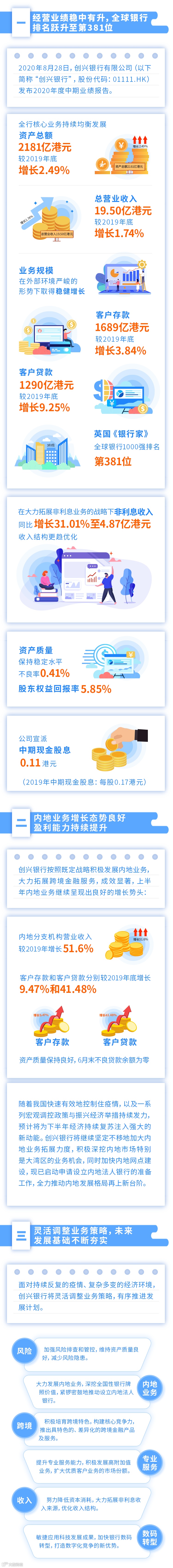 创兴银行主席张招兴表示,“创兴银行在2020年上半年面对严峻的经营环境,坚守稳健的经营原则,全面强化风险防控,保持各项业务平稳发展,竭尽所能为客户提供优质的金融服务。展望下半年,创兴银行将全力应对变局,贯彻稳健经营理念,积极防范和管控疫情及各类风险,加快结构优化和数码转型,稳步提升各项核心业务能力;同时加快内地业务发展,进一步拓展内地网点建设,有序推进内地法人银行的筹建工作,为本银行的未来发展增添新动力。”