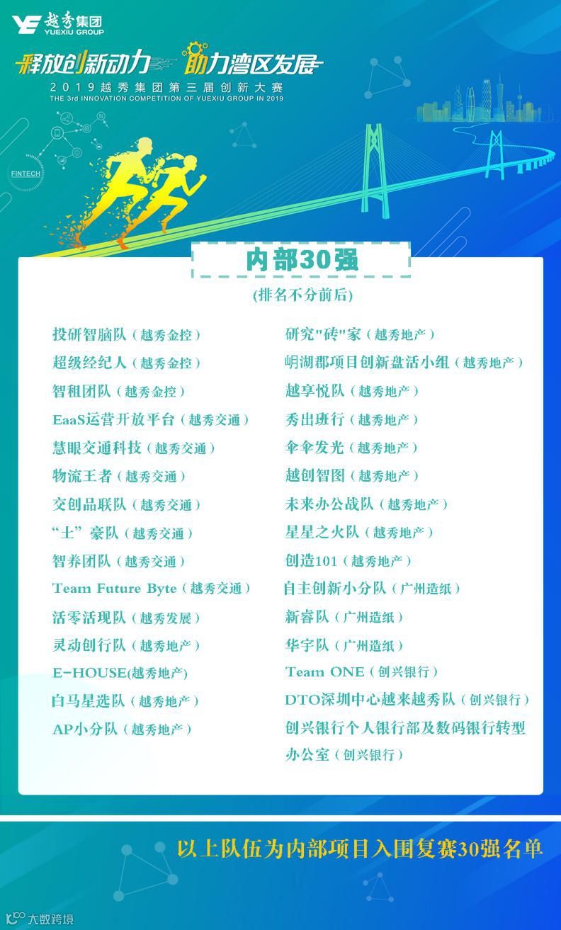 本届大赛共有161个内部创新项目顺利进入到大赛海选。为紧扣创新大赛“释放创新动力,助力湾区发展”主题,内部项目海选评审共邀请25位专家导师、分成5个评审小组针对“创新性”“价值与效益”“可落地性”以及“战略匹配性”四个维度进行打分。为了确保评审的公平性、一致性,现场评审还增加了“评审总结会”环节,各组选出的优胜项目,还需要接受各评审小组的联合检视。经过一系列严格评审,最终确定了晋级越秀集团第三届创新大赛复赛的30个内部项目。