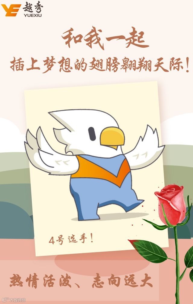 自我介绍:从远处看我,就是越秀英文首字母“Y”和卓越(Excellent)的英文首字母“E”卓越演化成的一只展翅的鲲鹏;接近我你就会发现,我是一个Q萌版的小鲲鹏,除了更加呆萌可爱以外,正如“鲲鹏传说”一样,我也有着大大的梦想和满满的希望;展开的双翅,让我随时可以翱翔,不断超越自我是我的目标,变得更加优秀是我和越秀人一样的价值观;金色的嘴巴和越秀金一样,寓意着朝气活跃、亲和进取。
