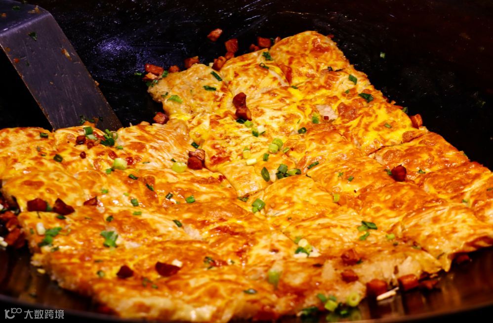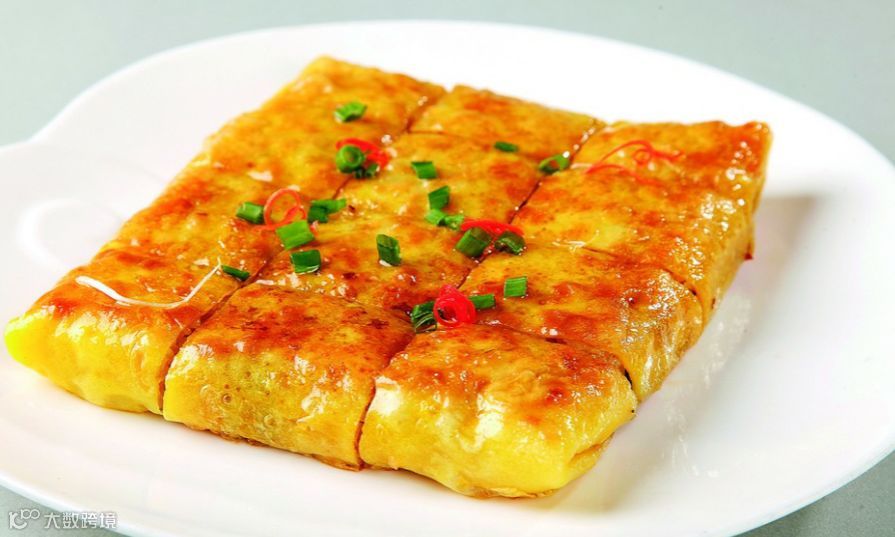 豆皮由绿豆、大米混合磨浆,在锅里摊成薄皮,内包煮熟的糯米、肉丁、鲜蛋、鲜虾仁等馅料,用油煎慢慢煎制。其皮金黄发亮,色泽诱人,入口酥松嫩香,味道丰盈,层次分明,回味无穷!
