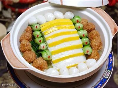 三菜合烧,鱼有肉味,肉有鱼香,别有风味。三菜一碗,色泽丰富,两白一金,上桌来,喜庆不少。由于三菜中有鱼、丸、糕三字,鱼与余谐音,丸在当地的方音为圆,糕与高同音,人们便赋三鲜以年年有余、家家团圆、步步高升的寓意,为图吉庆,年节必备的美食佳肴。