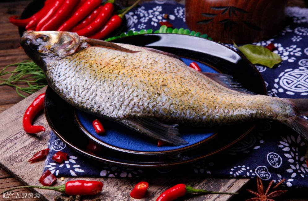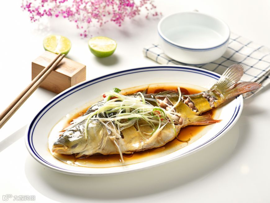 武昌鱼成品鱼形完整、色白明亮、晶莹似玉,鱼身缀以红、白、黑配料,颜色非常好看。尝一口肉质细嫩,还有浓浓的香味扑鼻。
