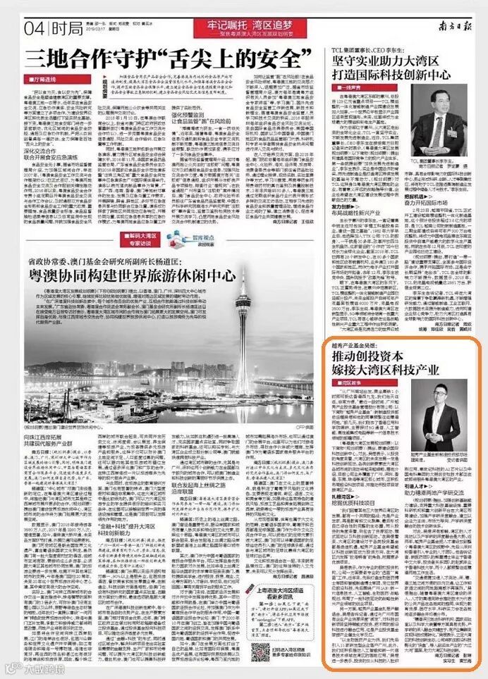 春风正暖,粤港澳大湾区已扬帆起航,资本涌动的南粤大地孕育无限希望。近日,越秀产业基金“颜值担当”、新制造投资部总经理吴煜,登上了华南权威政经大报——《南方日报》,以其亲身体验和感悟,阐述了粤港澳大湾区的发展变化与投资机遇。