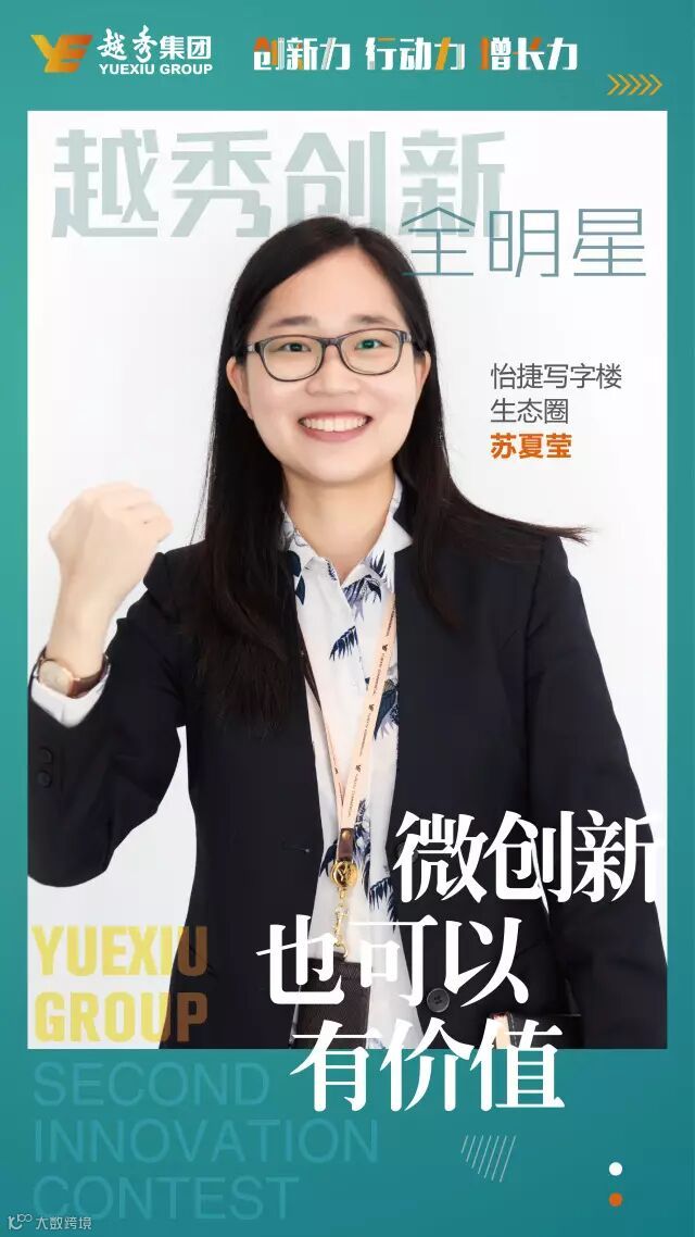 在首届创新大赛中,苏夏莹从客户需求切入,从细节着手,努力提升物业服务水平。所以她鼓起勇气组建队伍报名参加创新大赛,提出怡捷写字楼移动平台创新项目,即以微信公众号平台为载体,线上整合维护、出行、快递、外卖等资源,为客户随时随地解决问题;线下策划节目互动,深入打造具有商务功能的优质白领社交圈,提升了物业服务的附加价值。