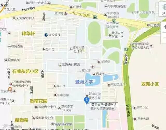 大道方向:A)坐公交车。需在BRT师大暨大站下。往前走约200米到暨南大学(北门);B)坐地铁(华师站C出口),往中山大道方向走到暨南大学(北门),第一个分叉路口右转直行至下一路口左转,直走650米即到管理学院(右边为图书馆)。