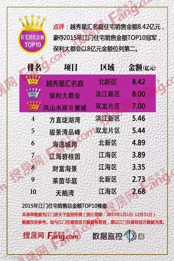根据搜房网数据监控中心权威发布的《2015年度江门房企销售排行榜》,2015年,越秀星汇名庭网签金额达8.42亿元,稳坐江门楼市头把交椅。