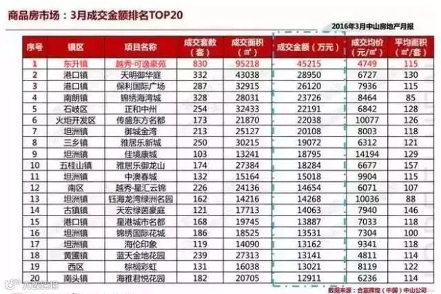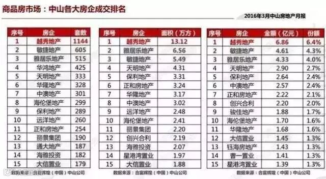 据合富辉煌的数据统计,三月份,越秀地产在中山包揽了套数、销售金额、成交面积的三项冠军;