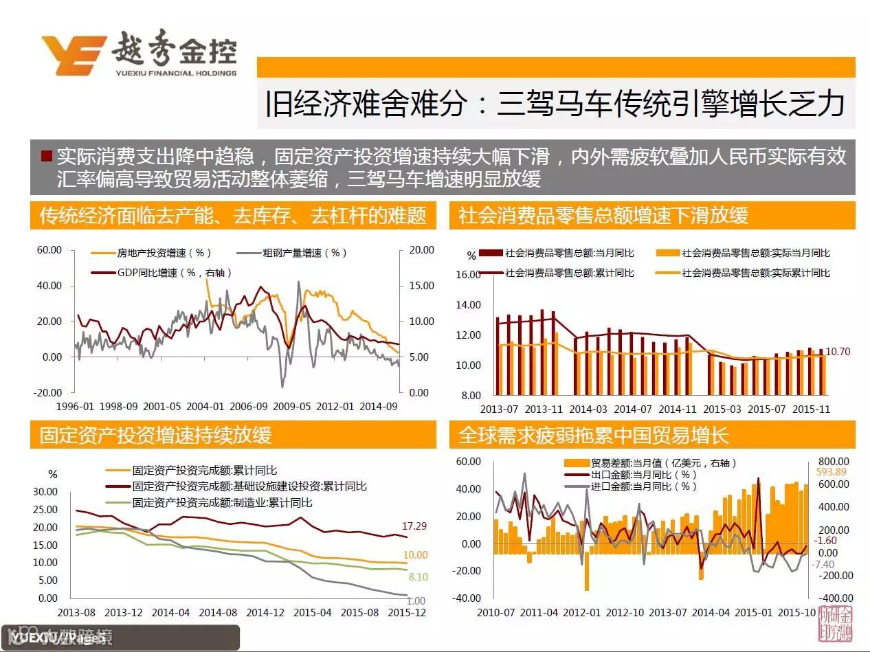 ◆ 2015年国内经济下行压力加大,消费支出降中趋稳,固定资产投资增速大幅滑,内外需疲软叠加人民币实际有效汇率偏高导致贸易活动整体萎缩,“三驾马车呈换挡减速态势”;2016年国内经济增长缓中趋稳,宏观政策或将定调为宽财政、宽用、稳货币,货币宽松程度可能边际减弱,刺激力度弱于2015年,货币市场回购利率或阶段性见底,但中期内利率债仍有配置价值,地方债和离岸债可能成为新的价值洼地。