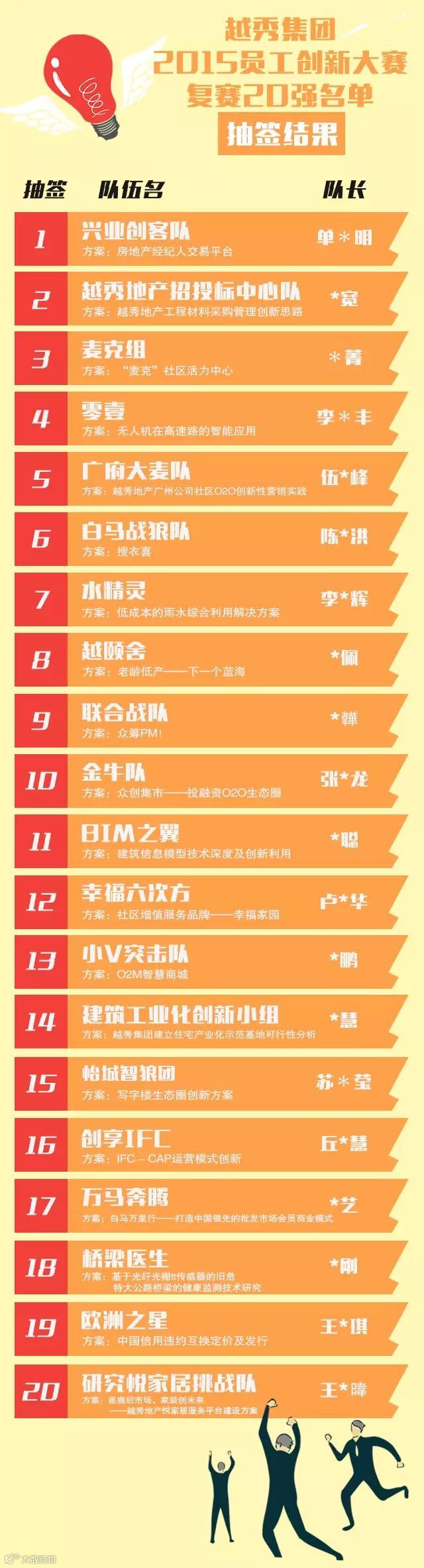 10月30日复赛的具体地点和相关注意事项,我们将在后期于越秀集团微信号和创新大赛官网持续更新,请大家密切关注。
