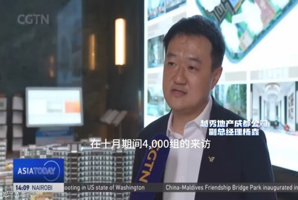 近年来,成都城市吸引力不断增强,近10年来成都住房成交总量始终保持全国副省级城市第一。国庆黄金周期间,成都楼市更是迎来了一波热潮,新房和二手房市场均呈现出强劲的成交势头。中央广播电视总台 CGTN 《今日亚洲》记者采访了越秀地产成都公司的副总经理杨鑫,他表示:“十一期间,公司在成都的五大项目共吸引4000多组客户到访。”