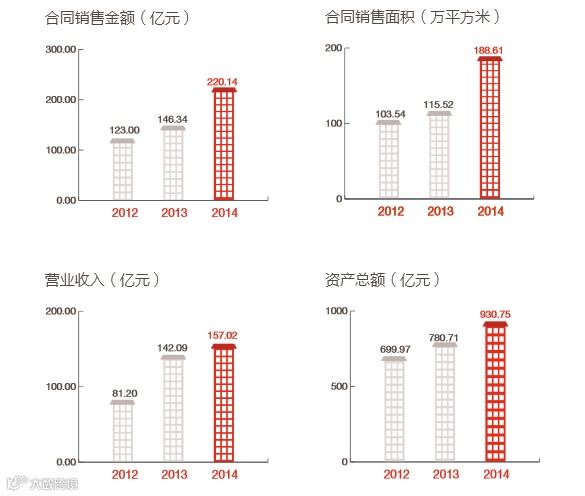 ●2014年,越秀地产实现220亿元的合同金额销售目标,同比增长50.43%,增幅雄踞香港上市内资房地产股前列;