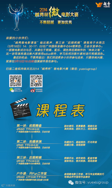 “越秀微电影课堂”第三讲“后期剪辑”课程本周五下午开讲!欢迎小伙伴们报名参加!