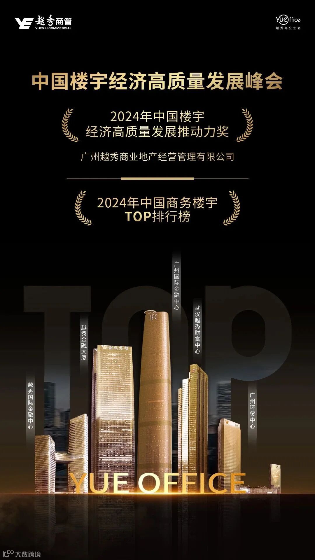 凭借高质量发展态势与对长期主义理念的坚持,越秀商管荣获由“中国楼宇经济高质量发展峰会”颁发的“2024年中国楼宇经济高质量发展推动力奖”,此外,在管项目广州国际金融中心(广州IFC)、越秀金融大厦、广州环贸中心(广州ICC)等5大标杆项目入选《2024年中国商务楼宇TOP排行榜》,为广州发展提供极具竞争力的澎湃势能。