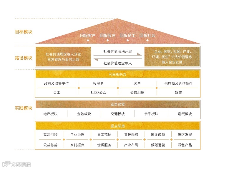 综观越秀集团履行社会责任的脉络,越秀集团以“回报客户、回报股东、回报员工、回报社会”的企业使命为引领,构建目标、路径、实践相统一的社会责任管理模式,将社会责任管理的理念和方法融入到具体的战略、运营、管理中,努力实现企业运营和推动可持续发展的有机统一。