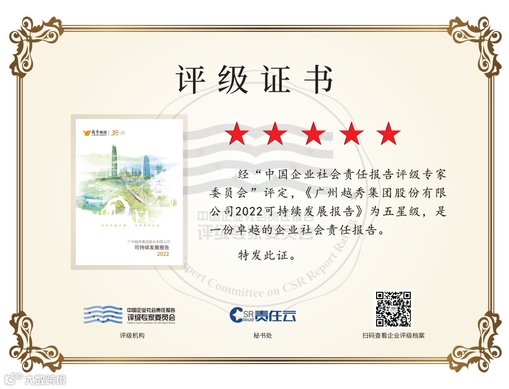 11月16日,由中国社会责任百人论坛、责任云研究院主办的“第六届北京责任展开幕式暨《企业社会责任蓝皮书(2023)》发布会”在京召开。越秀集团获“2023责任犇牛奖—责任管理奖”。同时,越秀集团2022可持续发展报告获“五星”评级,为广州市属国企里唯一一家获“五星”评级的单位。