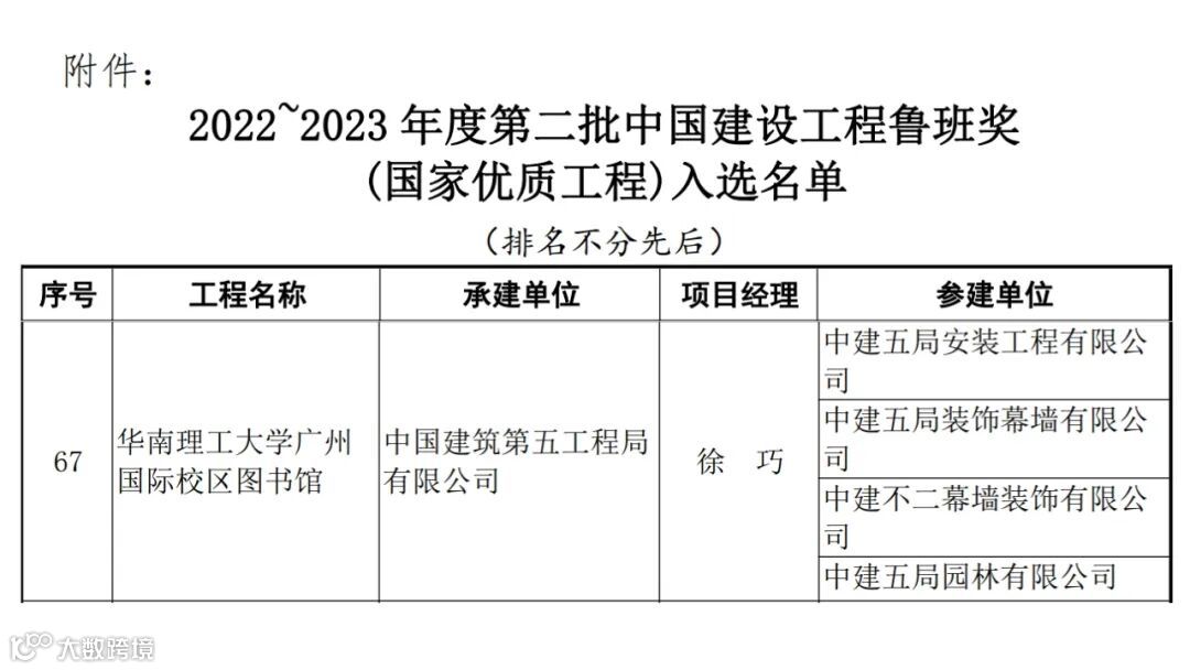 11月28日,中国建筑业协会2022-2023年度中国建设工程鲁班奖(国家优质工程)评选结果揭晓,由越秀集团旗下越秀地产建设的华南理工大学广州国际校区图书馆荣获中国建筑行业工程质量最高荣誉“鲁班奖”,该项目是由教育部、广东省政府、广州市政府和华南理工大学四方共建的重点项目。