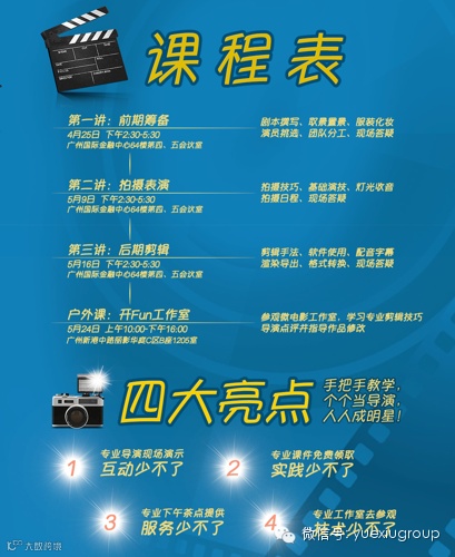 神剧本?秀演技?闪拍摄?炫剪辑?这些平时想也不敢想的词儿,如今都将有机会在“越秀微电影课堂”手把手学习,三下五除二,轻松学习专业微电影制作。