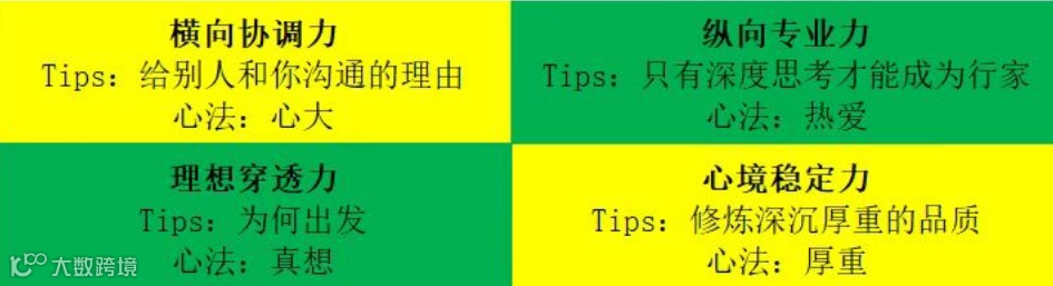 本质:是自身的横向影响力,是链接他人、影响团队的能力。体现为"心的宽厚度"。
