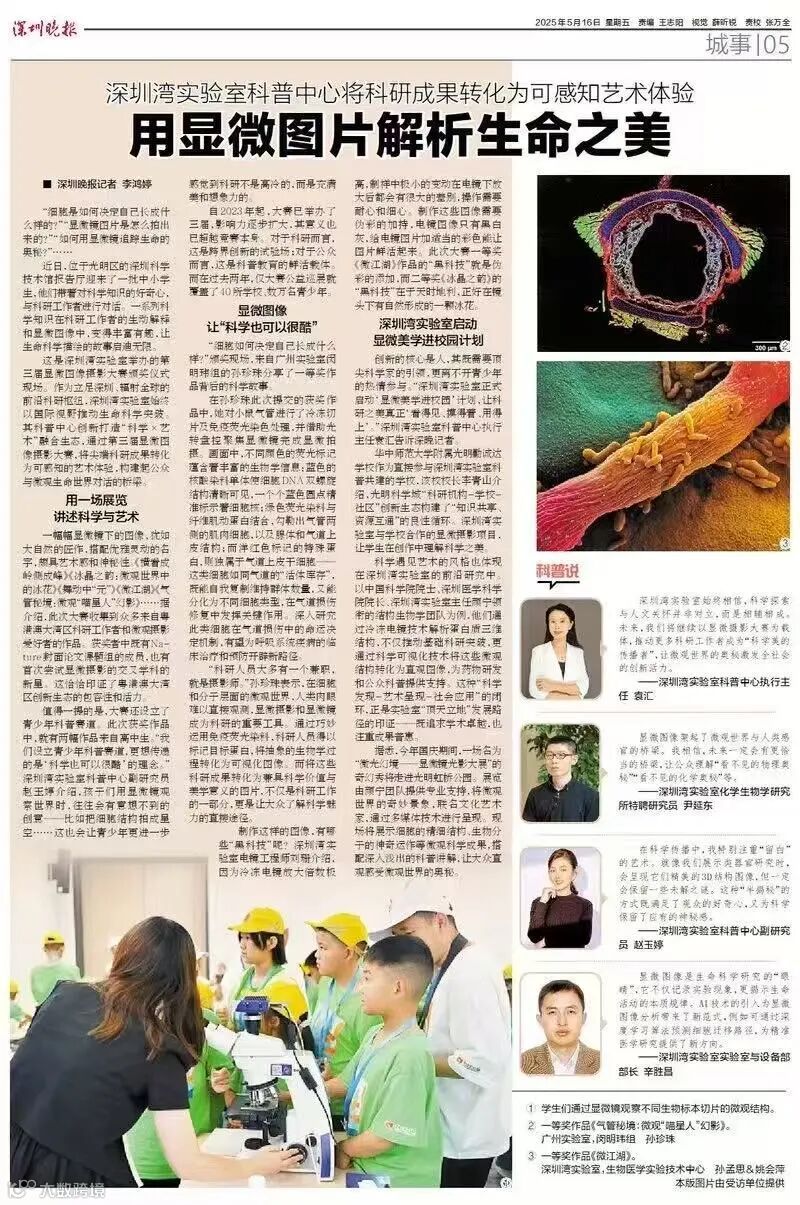 本文内容转载自《深圳晚报》2025年5月16日A05版(作者:李鸿婷),原文标题《深圳湾实验室科普中心将科研成果转化为可感知艺术体验,用显微图片解析生命之美》。广州千江企业集团为文中深圳湾实验室科普中心显微镜支持方,助力青少年科学素养提升。