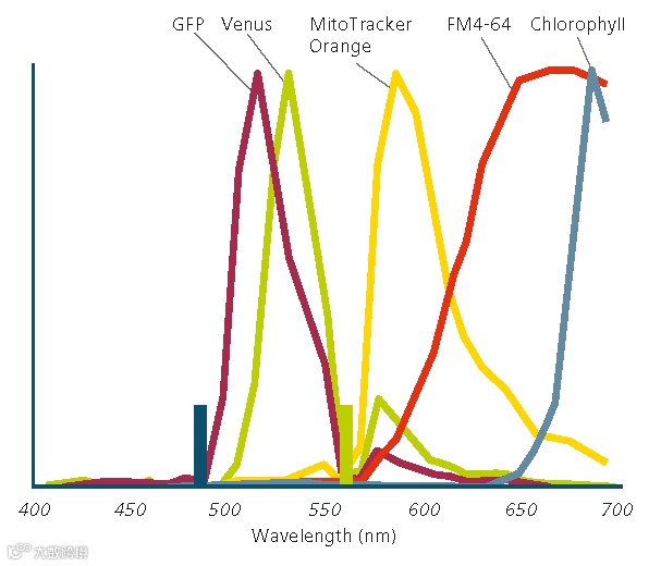 2. 充分考虑荧光蛋白的光谱特征。进行多色荧光成像时,根据光谱范围灵活选择荧光蛋白,避免串色。大家可以通过蔡司Light Lab(iOS)查询荧光蛋白的光谱。