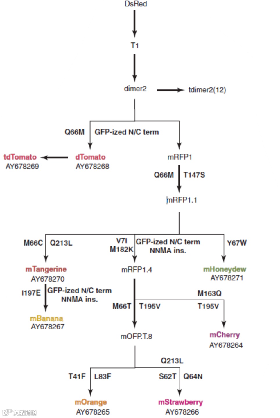 ▲ 图2. 野生型DsRed衍生突变体谱系