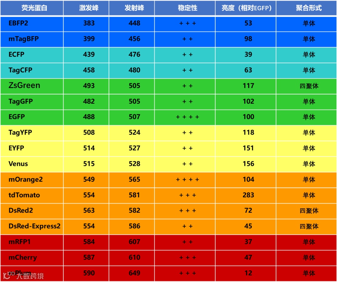 ▲ 附:常见荧光蛋白特性概览