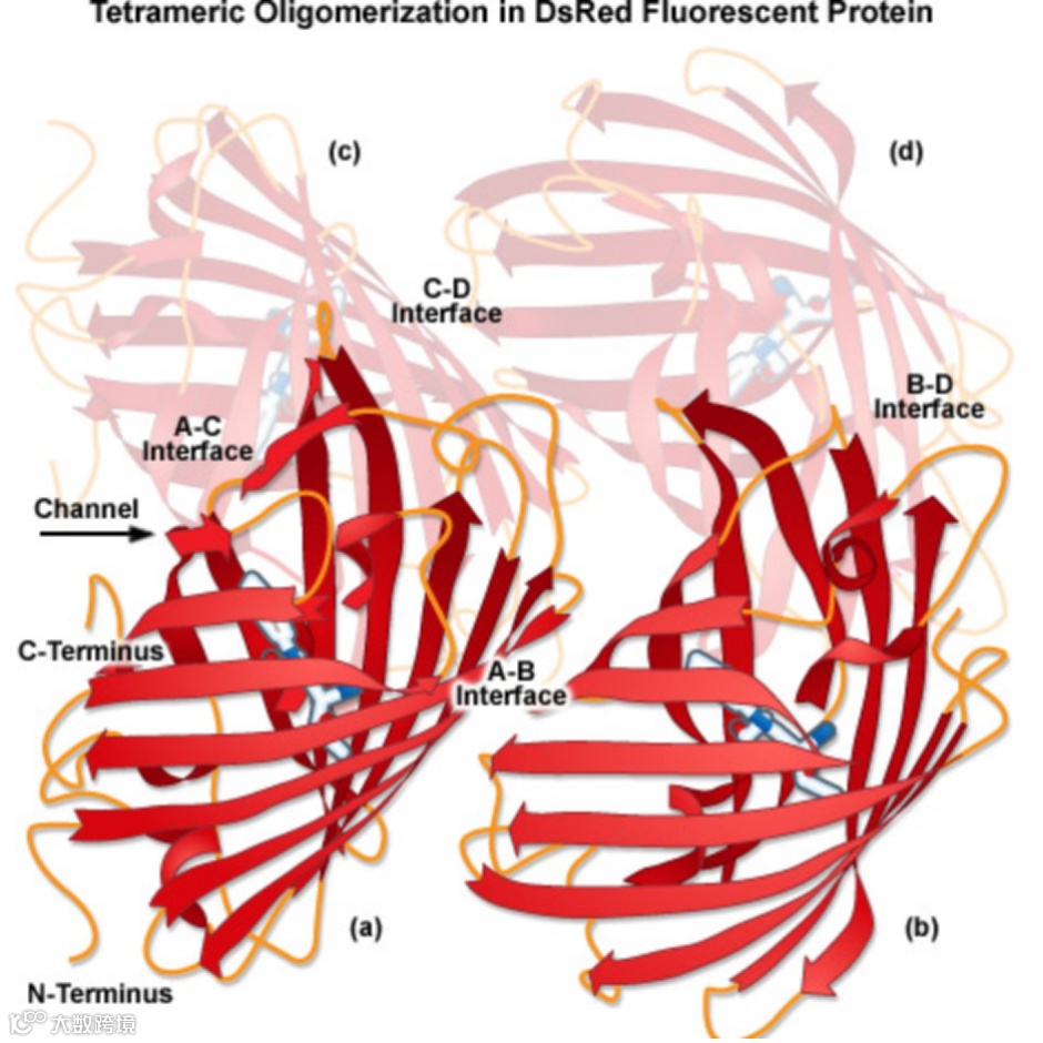 但很快,人们发现野生型DsRed作为荧光标签存在诸多限制因素,使其作为蛋白质定位的用途非常有限。首当其冲便是成熟速度,野生型DsRed成熟缓慢。在成熟过程中先形成一个绿色发色团,进一步氧化才能形成红色发色团,这种“绿色状态”引入了信号串扰,限制了DsRed在多色实验中的应用。此外,DsRed是一种专性四聚体(如图1),有形成寡聚体的倾向,这种聚集可能会对细胞产生毒性,更重要的是影响融合蛋白的定位,妨碍对目的蛋白定位的判断。