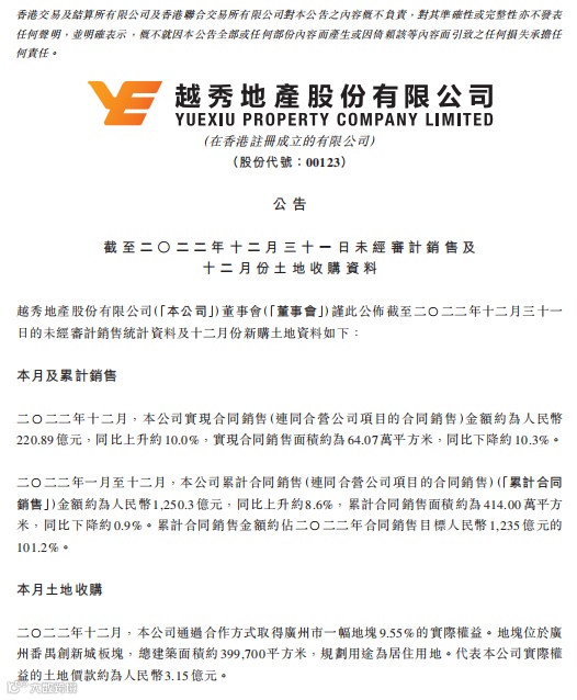 1月9日,越秀地产股份有限公司(股票代码:00123.HK)发布截至2022年12月31日未经审计销售统计资料及12月份土地收购资料。公告显示,越秀地产2022年12月实现合同销售金额约为人民币220.89亿元,并通过合作方式取得位于广州、杭州两座城市共计三幅地块。