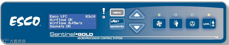 △ Esco新型Sentinel Gold超大屏数显微电脑程控系统可实时显示柜内运行参数,当风速过度波动时提供声光报警。