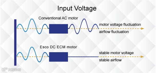 △ 自带电压波动补偿功能和阻力感应补偿功能,在电压波动和过滤器堵塞压力增加300%的情况下,依然可以保持安全的风速。