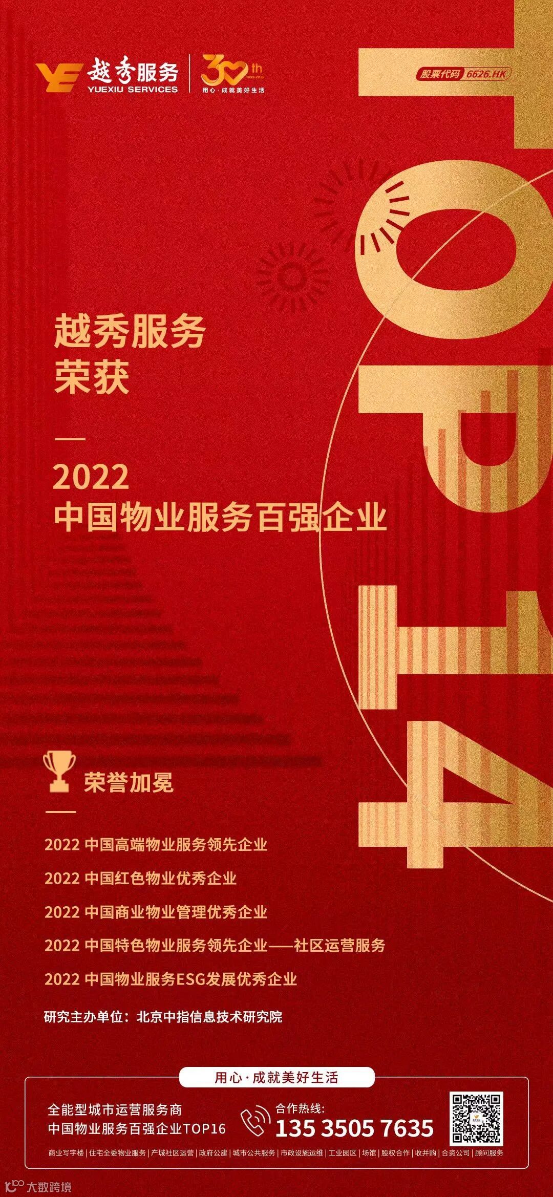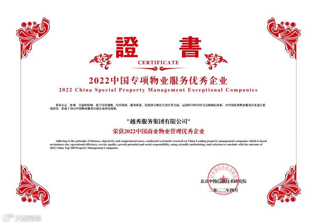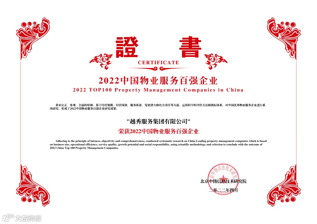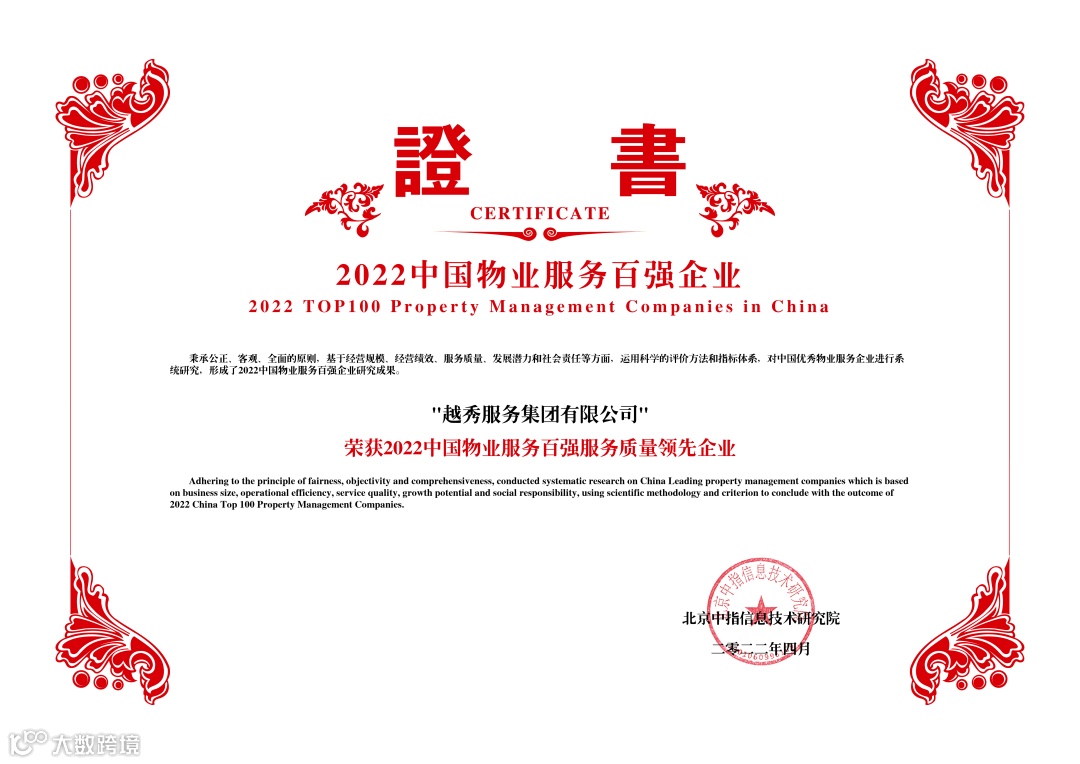 2022年4月26日,由中指研究院主办,“新价值·新担当·新征程”为主题的“2022中国物业服务百强企业研究成果发布会暨第十五届中国物业服务百强企业家峰会”在北京隆重举行,越秀服务凭借强劲的综合实力荣膺八大奖项。