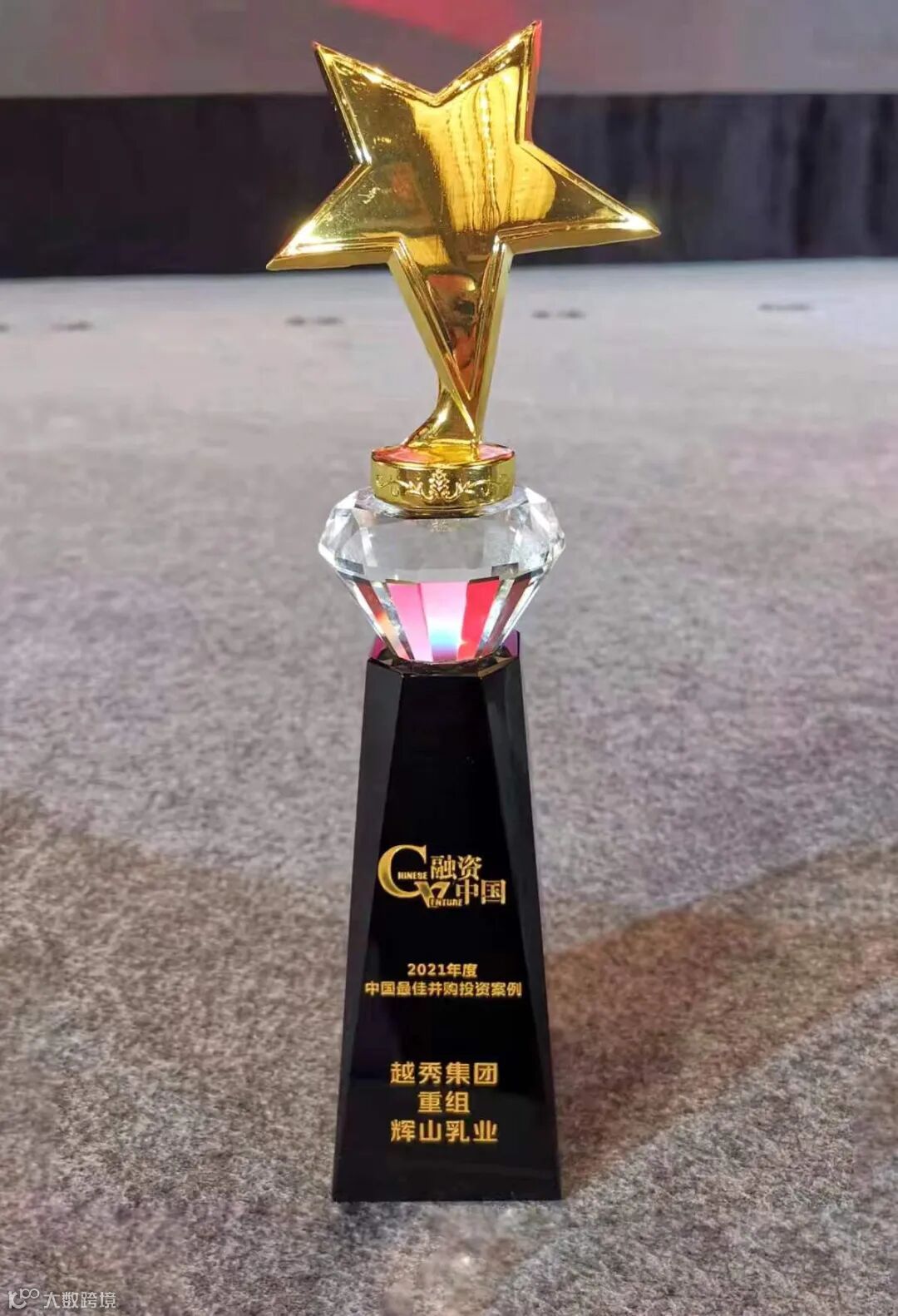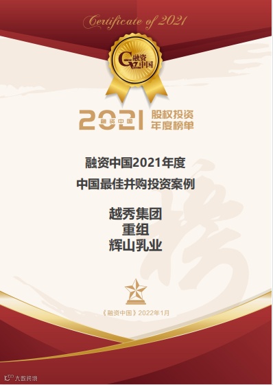 2022年1月12日,由知名股权投资财经月刊《融资中国》举办的“融资中国2022(第11届)资本年会暨颁奖盛典”在上海召开。 越秀集团重组辉山乳业项目的案例荣获“融资中国2021年度中国十佳并购案例”称号。据主办方评价,该项目债务类型复杂,跨度时间长,其最终能成功完成并实现多方共赢,属于乳业食品领域标杆性的并购重组案例。